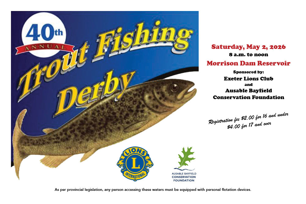 The Exeter Lions Club says " ... we are excited to keep our partnership with the Ausable Bayfield Conservation Foundation rolling with our upcoming Trout Fishing Derby at the Morrison Dam Reservoir on Saturday, May 3, 2025 from 8 a.m. to 12 p.m. noon."