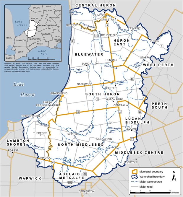 Here is a map showing municipalities of the Ausable Bayfield Conservation Authority watershed: